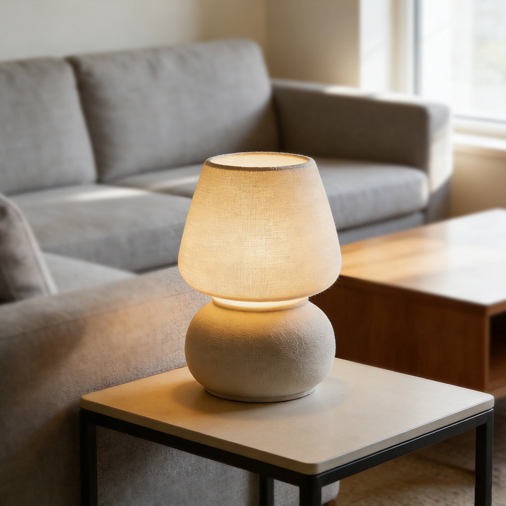 A compact table lamp with a linen-textured shade that turns harsh light into a soft, calm glow. The rounded base adds a gentle sculptural feel, making it perfect for bedside styling, small desks, or layered lighting on shelves. This is the kind of lamp that makes a room feel finished without trying too hard.